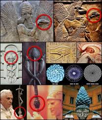 Zoals je op de afbeelding ziet, houdt de paus een staf vast met daarop de pijnappelklier afgebeeld, zo ook een lid van de Annunaki links bovenaan de afbeelding.